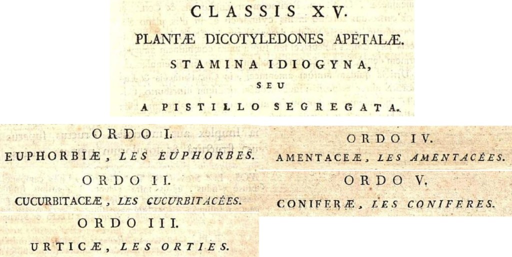 Infine le ben note conifere. Forse è utile precisare che Il termine coniferae è precedente a Jussieu. Ricordo che nel 1789 non era ancora stata riconosciuta la gimnospermia (cioè la mancanza di un ovario che racchiuda l’ovulo). Dunque anche Jussieu al pari di Linneo considera veri fiori maschili e femminili i coni di pini, tassi, ginepri e tuie, così si può ripetere per lui quanto detto nel caso del Professore di Uppsala.