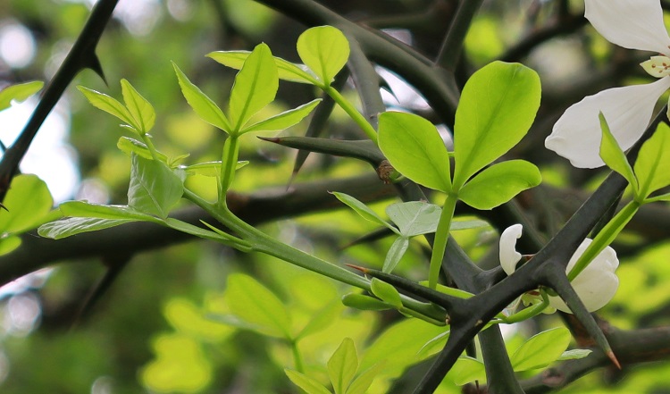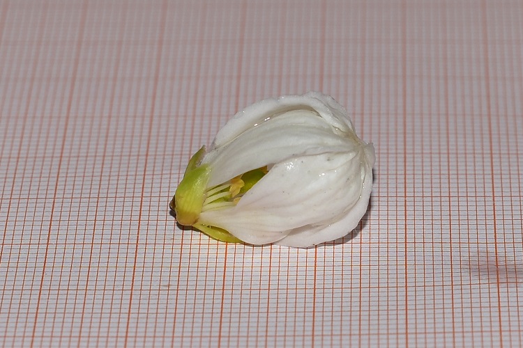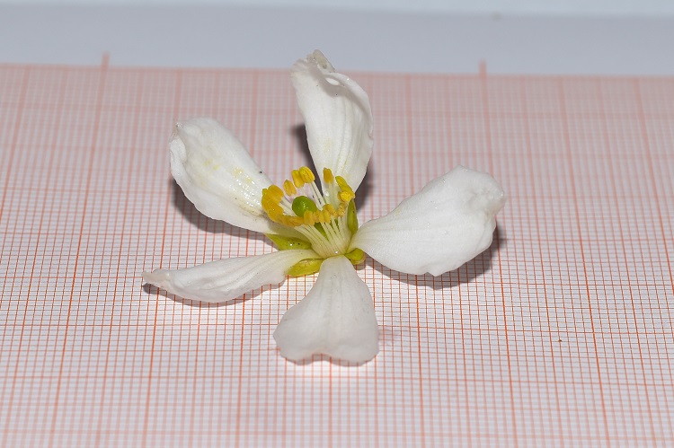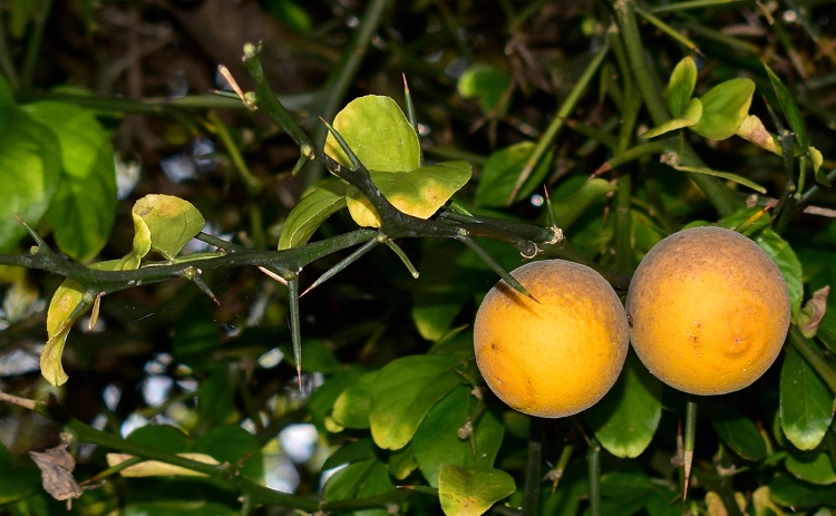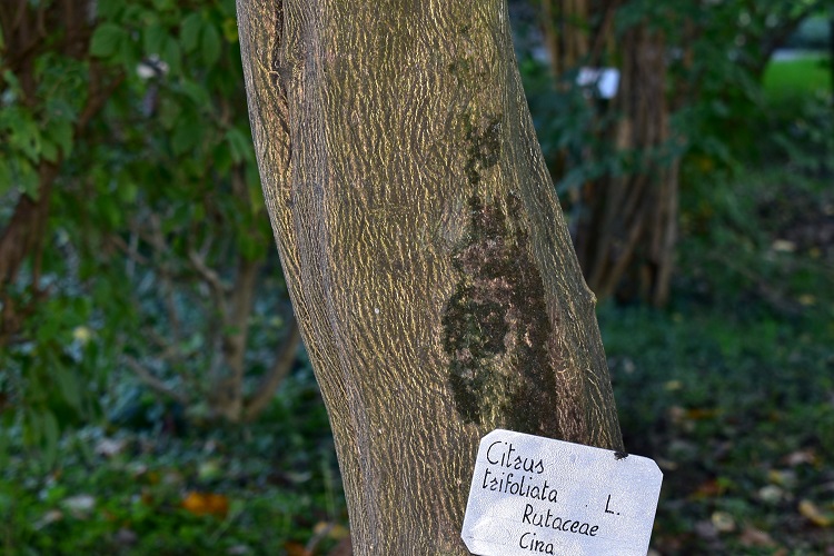 Nessuno, che io sappia, vive in città. In compenso in Orto ce ne sono due. Uno abita presso le serre ottocentesche.L’altro vicino alla vecchia entrata fra cactacee (in estate) e palme cinesi.Un arzillo vecchietto (cresciuto a modo suo) vive nel giardino alpino del Jardin des Plantes Due giovinetti li ho incontrati invece all’Orto Botanico di Torino. Foglia composta da tre foglioline di cui la mediana decisamente più grande. Han forma tondeggiante, consistenza del cuoio, colore verde brillante sopra e sotto. Lamina a base acuta e vertice ottuso, bordo con denti piccoli, venature sottili ma ben visibili. Picciolo lungo e alato. Rami sottili, verdi e appiattiti. Foto in aprile.L’inverno è il periodo migliore per osservare rami e rametti con le loro grosse spine, come in un quadro astratto. L’albero è l’unico fra gli agrumi a perdere le foglie.L’attaccatura delle spine forma una specie di ala. Le foglie ingialliscono di tonalità scialbe e durano poco sulla pianta, anche rametti e spine sbiadiscono.Fiorisce tra marzo e aprile, inizialmente coi rami spogli, che cominciano a rinverdire,……poi compaiono le prime tenere foglie e l’aspro aspetto iniziale si addolcisce. Fiori bianchi a simmetria pentagonale, i più grandi fra gli agrumi. Petali lunghi, ben distanziati. Calice con cinque sepali appuntiti e ben visibili fra le unghie strette dei petali.Al centro una corona di stami (tipica del genere citrus) che racchiude un pistillo tracagnotto con stigma grosso e verdissimo.Nel bocciolo i lunghi petali sono ripiegati verso l’interno a formare un bottoncino ellissoidale. Tolti calice e corolla si distingue bene la formazione compatta dei filamenti……ma il carattere poliadelfo (tipico del genere Citrus) non sembra chiaramente riconoscibile1. Antere con due sacche polliniche ad apertura longitudinale. Stigma globoso, stilo spesso e peloso, ovario supero ricoperto anch’esso da fitta peluria. L’ovario poggia su un nettario giallo grondante umori.Sezione trasversale dell’ovario. Sette logge; in bella evidenza la placentazione assiale (gli ovuli sono attaccati a un asse centrale). Sezione longitudinale.Frutto in giugno. Manterrà la pelle feltrata fino a maturazione. Munito spesso di un piccolo capezzolo.Frutti di colore arancione, non molto grandi, e, come già detto, villosi. Profumano intensamente di una fragranza più grassa e agra di quella dei cugini.
