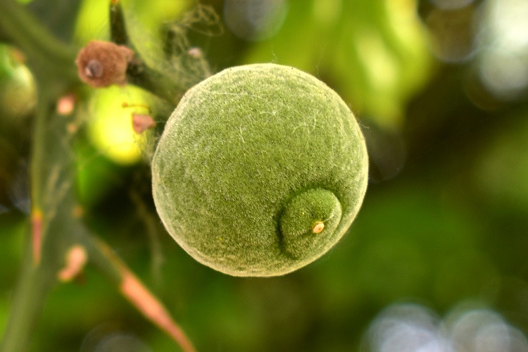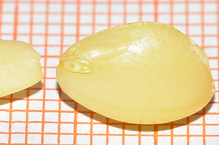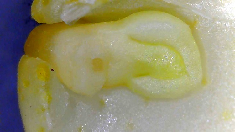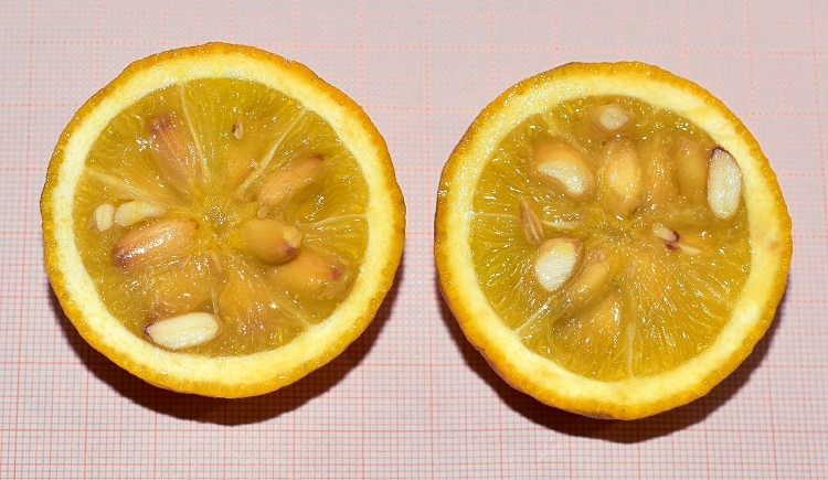Dentro la classica suddivisione in spicchi e tantissimi semi. Il frutto è una bacca (tecnicamente esperidio) Avvicinandosi si riconoscono le vescicole oleose sulla pelle e quelle della polpa all’interno. Una vescicola colma di succo.Nella foto uno dei cotiledoni con l’embrione.L’ingrandimento mostra due foglioline, l’apice e, a sinistra più scura, la radichetta. La macchiolina marrone sull’asse è la cicatrice dell’altro cotiledone.In questa pianta capita, spesso, di osservare semi che emergono dai frutti dopo che si sono fatti strada nella polpa e forato la buccia. Fulgido esempio della deiscenza (il frutto si apre e fa uscire i semi) nelle bacche, fenomeno raro e perciò istruttivo. Per le drupe del noce la cosa è ben nota, ma in quel caso il seme fuoriesce perché il mallo marcisce, e non è così spettacolare.La corteccia è un misto tra verde, marrone e grigio, si screpola ma non si fessura formando piccole creste scure e solchi chiari. Insomma, tipica degli agrumi.Credo meriti un primo pianoInvecchiando tende a torcersi e a formare fasci nervosi (che ricordano le scanalature del carpino bianco), ma sostanzialmente resta liscia.