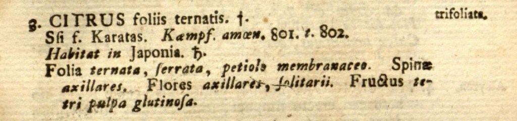 Citrus trifoliata L. Nome imposto da Linneo nel celeberrimo Species Plantarum, Stoccolma, 1753. Sinonimo Poncirus trifoliata (L.) Raf.