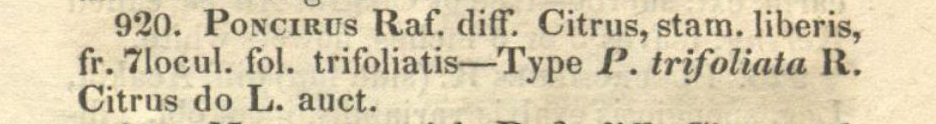 Oggi, come già detto, Poncirus trifoliata Raf. è ritenuto un sinonimo del Nostro.