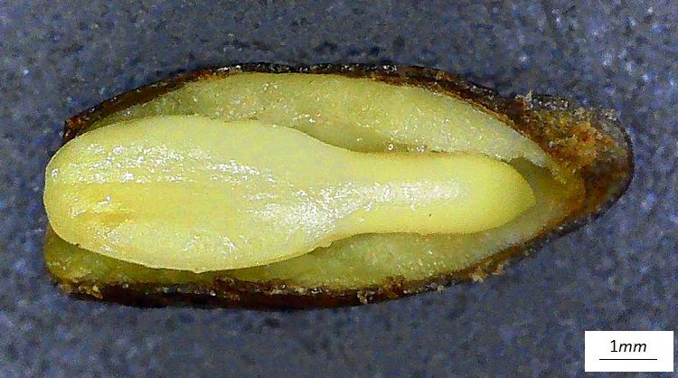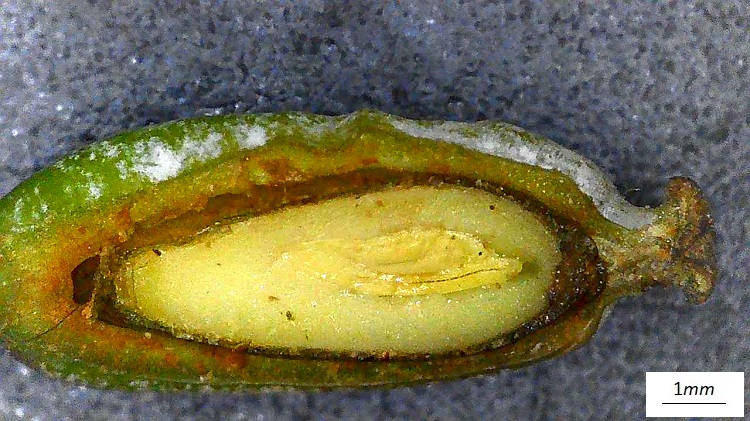 All’interno un seme disperso nella polpa. Nella foto sezione longitudinale di frutto e seme, si distingue in parte l’embrione.Il seme occupa gran parte dell’interno del frutto (poco endocarpo) e ne ripete la forma ellissoidale.Anche l’embrione occupa quasi tutto l’interno del seme (poco endosperma), la forma è diritta con i due cotiledoni accostati, visibile la radichetta dalla parte opposta. Corteccia grigio marrone con creste sottili e poco prominenti. Difficile fotografarla a motivo del fitto fogliame che inibisce l’accesso perfino alla luce.