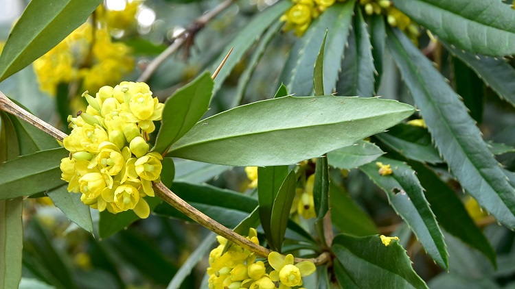 Una rotonda in Via Albania abbellita con arbusti, al centro il nostro eroeOrto, sullo sfondo le serre ottocentesche.Foglie allungate, verdissime e lucide, coriacee; vertice acuto e base che degrada lentamente verso un breve picciolo. La disposizione simula verticilli, ma le foglie sono a spirale (in numero di cinque (a volte di più a volte meno)) su brevi rametti.Venature poco visibili, quella centrale piega la foglia a forma di v molto aperta, le secondarie partono ortogonali dall’asse della foglia e poi formano occhielli avvicinandosi al bordo.Bordo a denti poco pronunciati… …muniti di spine insidiosissime.Pagina inferiore liscia e quasi senza venature, colore verde pallido.Rametti giallo grigi a sezione poligonale.Quando le temperature si abbassano (gennaio e febbraio) le foglie arrossiscono.Spine sottili e appuntite in formazione di tre (due angoli retti accostati e complanari) disposte appena sotto la rosellina delle foglie.Fiori gialli, piccoli e numerosi raccolti in infiorescenze semisferiche poste alle ascelle delle foglie e delle spine.Mazzolini di fiori dai lunghi peduncoli protetti da schiere di squame.Doppio giro di sepali a tre a tre, dimensioni diverse ma la stessa forma di ellissi allungate.Almeno sei petali gialli venati di verde, forgiati a cucchiaio e mossi al vertice.Pistillo a fiaschetta: grosso ovario supero, breve stilo, stigma appiattito e allargato. Sei stami piantati nel ricettacolo e alti quanto il pistillo. Antere a sportellino, scattano all’insù, disperdendo il polline, durante le visite degli insetti.I frutti sono bacche nero violacee a maturità, coperte di pruina bianca Appena formate in aprile, colore rosso aranciato.