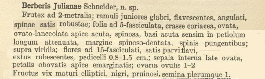 Berberis julianae C.K.Schneid. Il nome fu imposto nel 1913, praticamente ieri, da Camillo Karl Schneider, botanico e architetto paesaggista tedesco, in Plantae Wilsonianae, Cambridge, 1913. Il libro è costruito sulla collezione riportata dalla Cina da Ernest Henry Wilson esploratore inglese; collezione che doveva essere veramente notevole se richiese il lavoro di molti botanici coautori del libro in questione. Anche Schneider per alcuni anni viaggiò in Cina.
