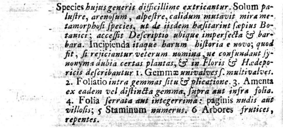 Linneo pone i salici nella classe ventiduesima (piante dioiche) secondo ordo (due stami) (Species Plantarum, pagina 1022). Naturalmente sa benissimo che ci sono salici con un numero diverso di stami, egli stesso conia i nomi delle due specie S. triandria e S. pentandria: i tassonomi non hanno scampo, devono spesso fare scelte sommarie. Linneo segnala il gran numero delle specie nel genere, e arriva a scagliarsi contro le descrizione ovunque ‘imperfette e barbare’. I Pioppi li mette nella stessa classe (la ventiduesima), ma nell’ottavo ordo (cioè tra le piante con otto stami); dunque già con Linneo si respira un’aria di famiglia.