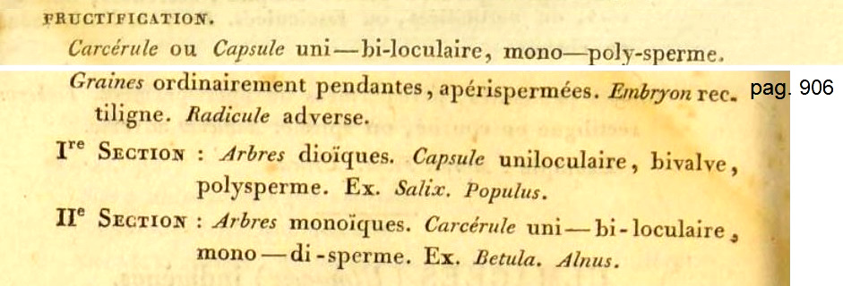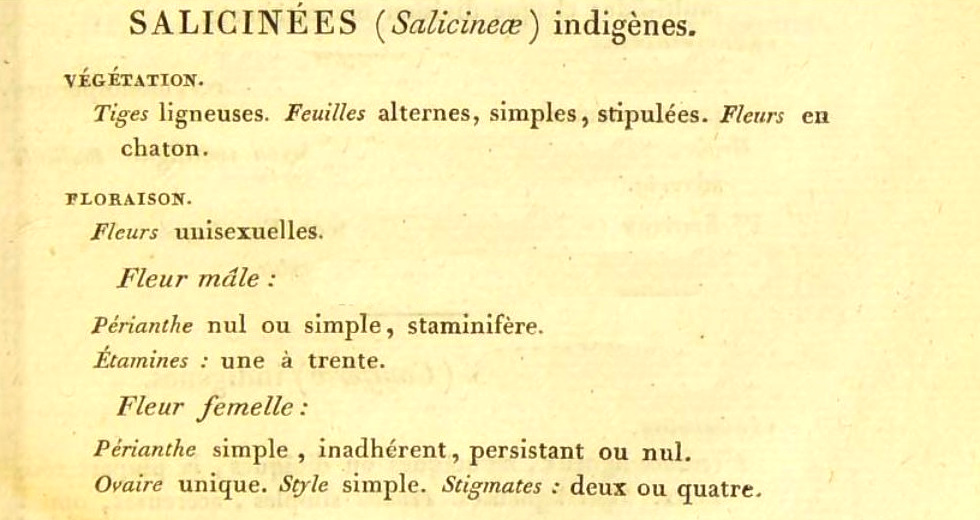 La pagina 905 degli Elémens di Mirbel. Foglie alterne, semplici, con stipole; Fiori in amenti (gattini). Fiori unisessuali, i maschili con la sola corolla o il solo calice o mancanti di entrambi, stami da uno a trenta. Fiori femminili con solo corolla o solo calice, ovario unico, stilo unico, stigma bifido o quadruplo.
