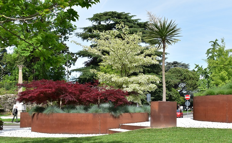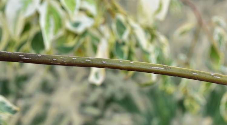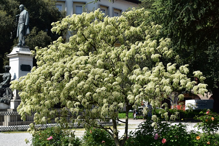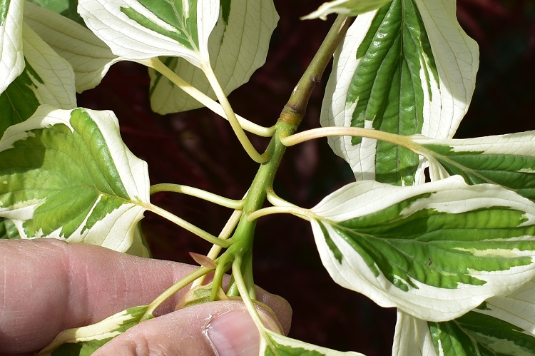 Un esemplare maturo a Villa Taranto (Verbania). Tronco dritto, rami spinti orizzontalmente e inseriti a gruppi alla stessa altezza, imitando il modo di procedere di certe conifere (ricorda il peccio). Il comportamento è evidenziato in questo altro esemplare, un po’ meno fronzuto, dello stesso giardino.In città è una tra le ultime specie arboree acquisite. In figura quello, di recentissimo impianto, nella grande rotonda ai piedi del Cavalcavia Borgomagno (lato Viale Codalunga).Un altro controversa, ben noto a questo blog, abita da tempo Piazza Mazzini. La chioma sembra molto più compatta, ma di recente sono ripassato è l’ho visto con un atteggiamento più canonico.Le foglie sono arrotondate e con le tipiche venature dei Cornus: le nervature secondarie si staccano già oblique dalla principale e poi si piegano come a seguire la forma del margine. Base acuta e vertice ancor di più. Bordo intero e leggermente ondulato. Picciolo piuttosto lungo. Colore della pagina superiore verde brillante.Pagina inferiore verde grigiastra, forse bluastra. Venature in rilievo; le terziarie scalariformi.Esiste una cultivar (Variegata) con la regione esterna color crema (più o meno intenso, a volte quasi bianco) e anche il picciolo ha questo colore. La forma è un po’ più allungata e lamina decisamente mossa.Disposizione alterna, come si è già detto. Nella foto il fenomeno è particolarmente evidente……ma non sempre è così, e ci vuole tanta attenzione. Solo un altro corniolo ha foglie alterne – il nome è scontato C. alternifolia – e, purtroppo, i due sono molto simili.I giovani rami sono verdi e muniti di lenticelle fittamente allineate in brevi striscioline.Gemma con molte perule assiepate strettamente. I fiori sono disposti in infiorescenze a pannocchia, talmente schiacciate da sembrare corimbi o ombrelle. L’aspetto è di piccoli cuscini ben gonfi adagiati fittamente sui sottili rami.In questa immagine, presa in maggio con i fiori appena fecondati, ben si distingue la forma a pannocchia.Fiori piccoli, crema, a simmetria quaternaria. Nel complesso sia l’infiorescenza sia i singoli fioretti ricordano il fratello C. sanguinea.Quattro lunghi petali a forma triangolare e altrettanti stami incastonati fra un petalo e l’altro. Pistillo alto con lo stigma che imita la testa di un chiodo.I frutti sono drupe di mezzo centimetro che da verdi diventano rosate e poi blu violacee. Non ho una foto da mostrare, la prendiamo in prestito da questo sito.Resti di stigma e stilo permangono fino a completa maturazione. (Foto Wikipedia)Corteccia grigia e liscia da giovane. Puntellata di lenticelle.Poi si screpola in creste strette e incrociate.