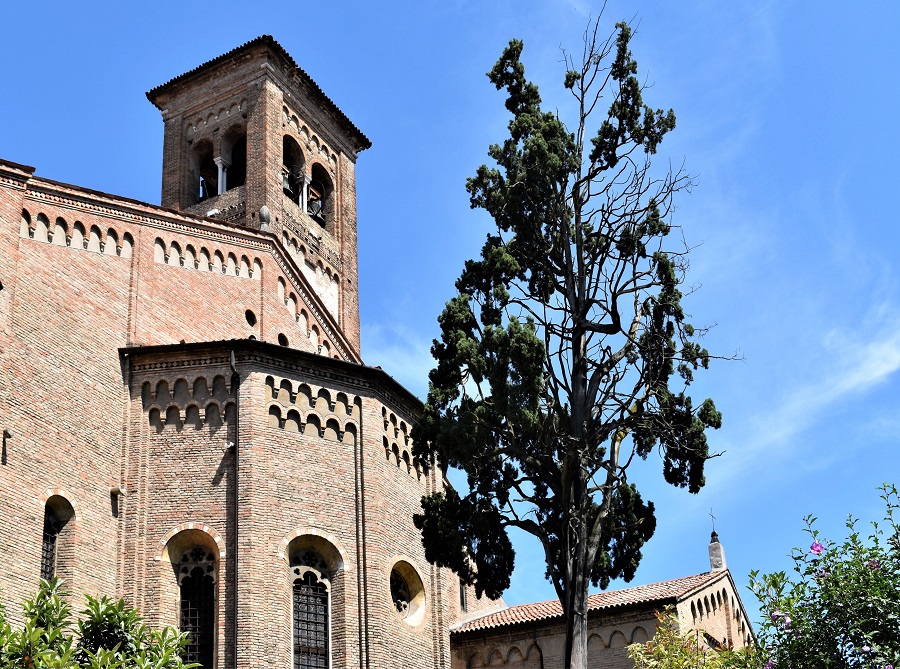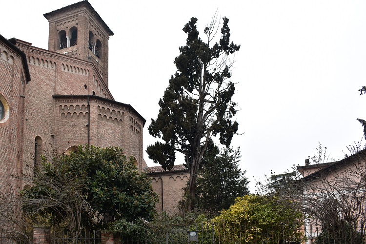 La chiesa degli Eremitani e il Cipresso (Cupressus sempervirens L.) nel piccolo giardino dietro l’abside. La striscia verde chiaro vicino all’albero è un muro che separa la proprietà della chiesa da un giardino privato. (Foto Google Heart)