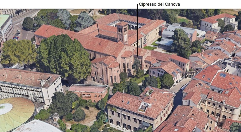 Grazie alla pubblicazione di un agile e molto circostanziato libro (Michele Armelin, Il Cipresso del Canova agli Eremitani di Padova, Armelin Musica, 2024) ogni amante degli alberi in città è venuto a conoscenza di un vegliardo dalla storia straordinaria. Luogo Piazza Eremitani, più esattamente il piccolo giardino prospiciente l’abside della chiesa; anno 1803; evento, l’edificazione di un monumento sepolcrale alla contessa Ursula M. K. L. D. zun Fürstenstein nata von Callenberg eretto nientemeno che dal Canova.