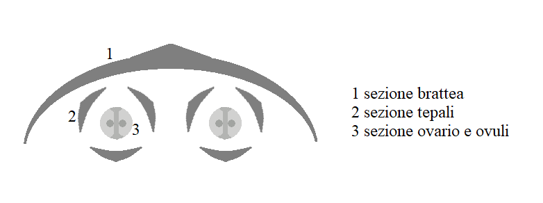 Diagramma fiorale del fiore maschile di Corylus avellana. Quattro antere sono riunite sotto un’unica brattea, ogni antera ha le coppie di sacche polliniche ben separate fra loro; un peduncolo sorregge i filamenti.