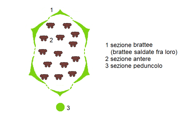 Diagramma fiorale del fiore maschile di Juglans regia. Il singolo fioretto maschile è formato da una brattea a sei lobi, nella cui parte interna sono attaccati, con brevissimi filamenti, una dozzina di stami; inizialmente verdi poi di un marrone molto scuro.