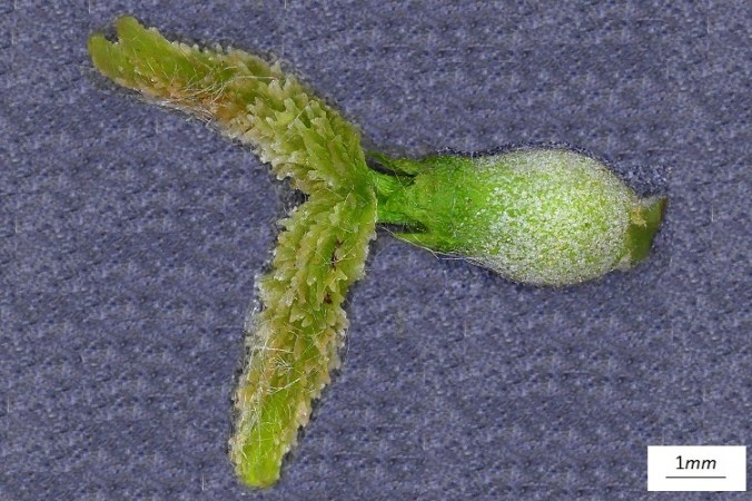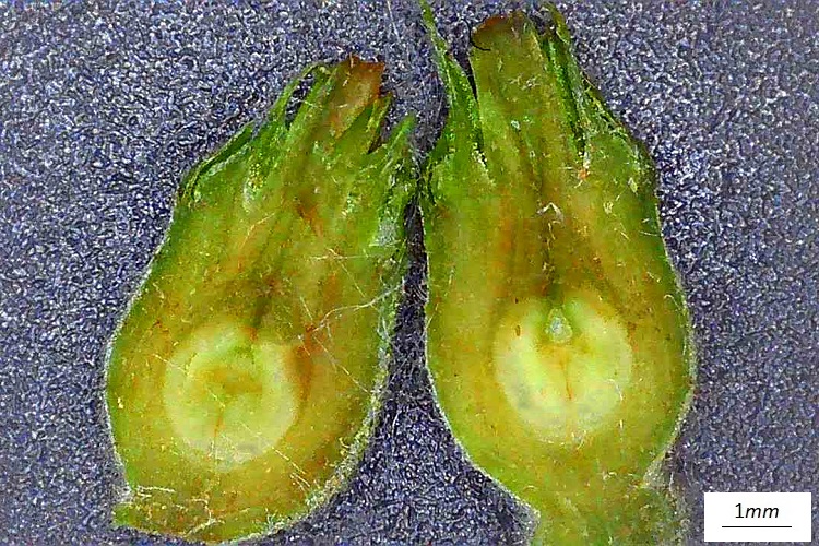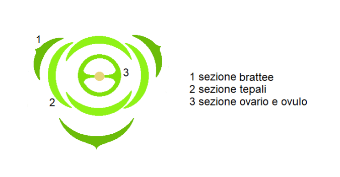 Diagramma fiorale del fiore femminile di Juglans nigra. Tre brattee esterne (1) e quattro tepali (2). Al centro un ovario a due carpelli ma con un solo ovulo sulla giunzione (3), in realtà le sezioni dell’ovulo e quella della giunzione sono fatte con piani ad altezze diverse.