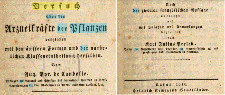 Frontespizio del libro di Perleb, Versuch über die Arzneikräfte der Pflanzen (Saggio sui poteri medicinali delle piante), Aarau, 1818. Il quale libro è la traduzione in tedesco del volume Essai sur les proprietes medicales des plantes, Parigi, 1816, di August de Condolle.