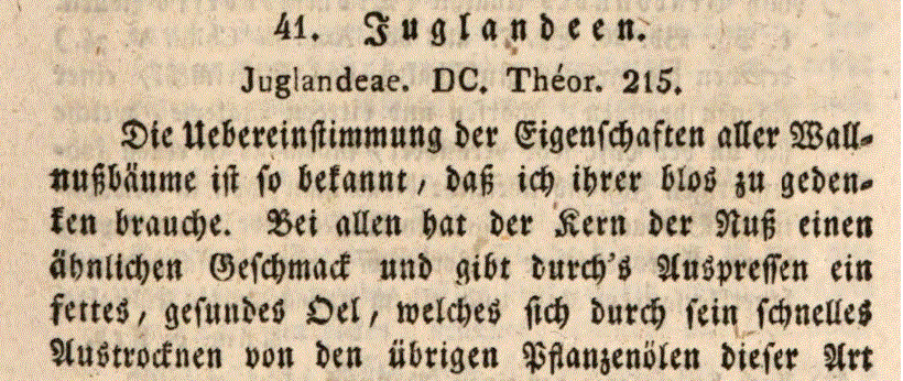 La famiglia avrebbe potuto a buon diritto comparire fra le amentacee di Jussieu (1789), ma bisognerà aspettare almeno il 1816 per il suo battesimo. E visto che il buon Perleb non ce li fornisce, diamo noi i caratteri della famiglia: piante monoiche di tipo arboreo; foglie composte, alterne e senza stipole; fiori maschili disposti in amenti; fiori femminili isolati o in piccoli gruppi o in spighe; frutti drupe (in barba al nome comune di molte specie della famiglia) o acheni alati. Ricordiamo i generi Juglans, Carya, Pterocarya.