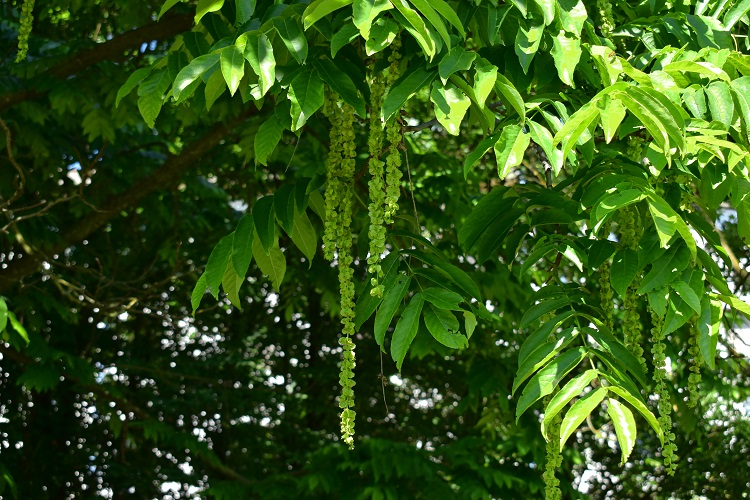 La partizione generata dalle diverse disposizioni dei fiori femminili si ripete nei frutti. Il primo gruppo produce drupe voluminose (con dentro le buonissime noci), il secondo genera acheni alati.