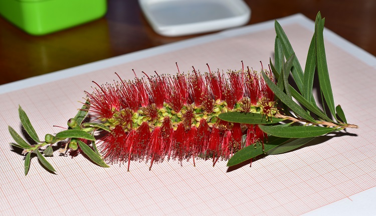 Callistemon è parola composta dal greco: kalòs=bello e stémon=stame. Il termine citrinus allude alle foglie che se stropicciate, odorano vagamente di limone.