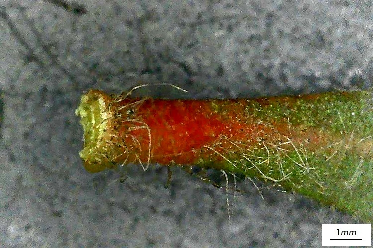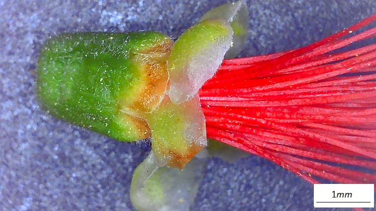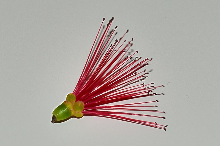 Singolo fioretto. Colpiscono in primo luogo i lunghi stami rossissimi sormontati da piccole antere violacee, e le modeste dimensioni di calice e corolla. Il largo ricettacolo denuncia un ovario infero.