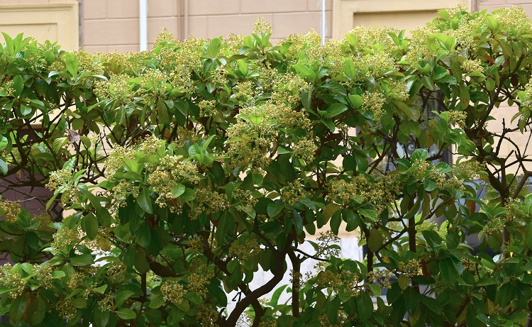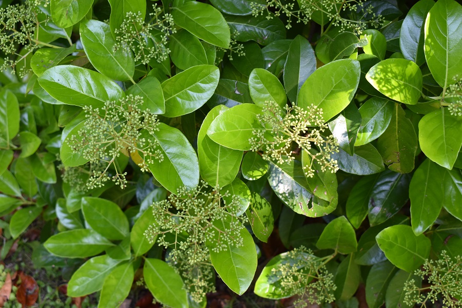 Arbusto sempreverde che può diventare anche molto alto, le foglie grandi e i rami assurgenti rendono la chioma voluminosa. Relativamente comune nei giardini italiani, soprattutto per farne siepi, ma non con la frequenza che meriterebbe, tanto che è impossibile trovare un nome comune condiviso dai vivaisti.