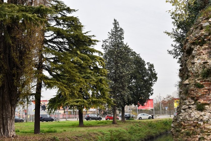 Per lo più cedri dell’Himalaya, un cedro dell’Atlante, un cipresso dell’Arizona, una magnolia bianca e un pino wallichiana. La foto mostra piante tutte in piena maturità.Uno scorcio sull’area. Sulla destra lo spigolo ovest del bastione e da sinistra: pioppo cipressino (già abbattuto alla data della perizia – luglio 2022), due cedri dell’Himalaya, cipresso dell’Arizona, magnolia bianca. Sullo sfondo Via Sarpi (la circonvallazione interna). (Foto, novembre 2019)Il bastione. Nella parte alta si distinguono le opere di restauro (foto dell’agosto 2022) e oltre queste le cime delle farnie fastigiate di Via Citolo. Sulla sinistra cedro dell’Himalaya e a destra una pianta a foglia caduca (forse un bagolaro). Non sembra che la vista del bastione fosse compromessa, anche perché tutte le conifere erano prive dei palchi più bassi. (Foto, agosto 2020)Sulla sinistra tratto del lato nord del bastione, a destra una cabina della rete elettrica, e in fondo la rigogliosa vegetazione (la cima più alta è del wallichiana). (Foto, agosto 2020)L’immagine riprende il punto di vista della prima delle tre foto precedenti. Sulla destra lo spigolo ovest del bastione e in fondo la cabina elettrica. La decimazione ha risparmiato un piccolo ligustro lucido, nato spontaneamente, e un altro cedro dell’Himalaya non inquadrato. (Foto, febbraio 2025)A sinistra parte del lato nord del bastione. (Foto, febbraio 2025)Oltre i platani della strada si riconosce la spianata e in fondo il bastione. Dove c’era vita ora c’è morte, dove c’era bellezza regna lo squallore. (Foto, febbraio 2025)Certo per l’estate spunterà dell’erbetta (che nel frattempo avranno seminato) ma la visione che ci ha accompagnato per molti anni è ormai definitivamente perduta, secondo il principio che recita: Il verde va ricostruito. Principio odioso e protervo che, assieme alla pretesa di lasciare libera la visuale delle mura, ha guidato la pulizia della cinta muraria in questi anni. (Foto, febbraio 2025)Una foto fatta nel novembre 2021 in occasione di una visita guidata al bastione appena restaurato. Sullo sfondo i platani, e davanti le conifere uccise; ultimo a destra si riconosce il wallichiana.Il restauro del bastione esprime bene il gusto del Comitato Mura (una libera associazione di cittadini che orienta le scelte dell’Amministrazione in molte questioni riguardanti le due cinte murarie).Il confronto con questa vecchia foto lascia senza parole. Invece di farne un deserto si sarebbe potuto salvare le specie cresciute spontaneamente.