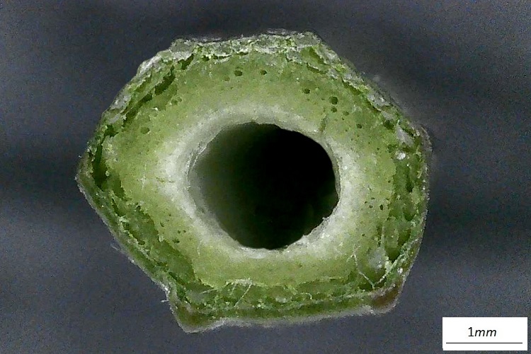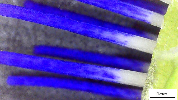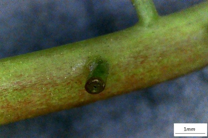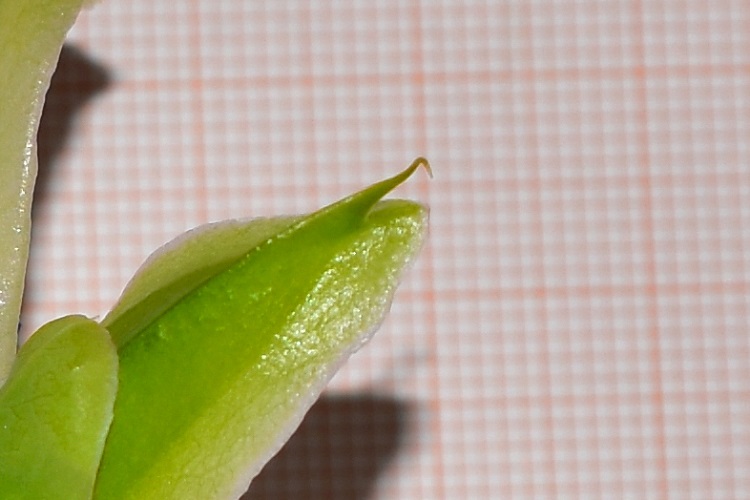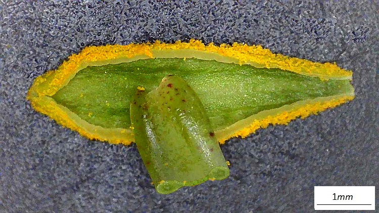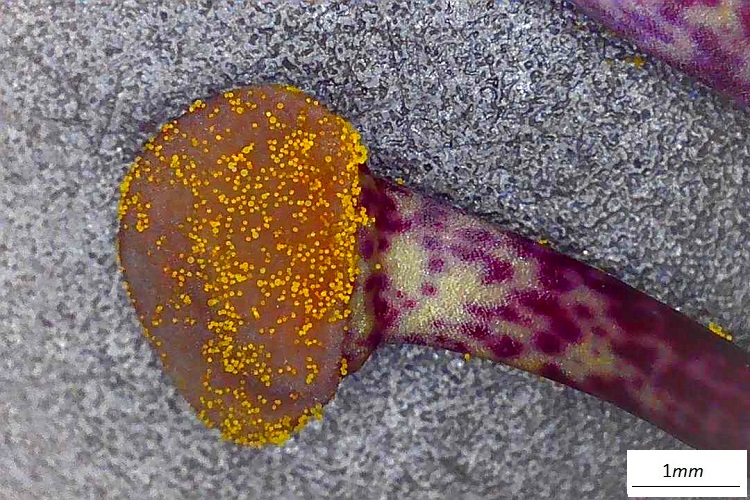 Stame dal tegumento molto esteso e vistosamente colorato; il filamento ha forma appiattita. Il tutto ricorda le sporgenze di un aliscafo.Incontro ravvicinato con uno stigma. I grani di polline sono particolarmente grandi in questa specie. Incredibili composizione cromatica e texture della superficie dello stilo.
