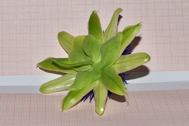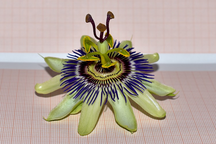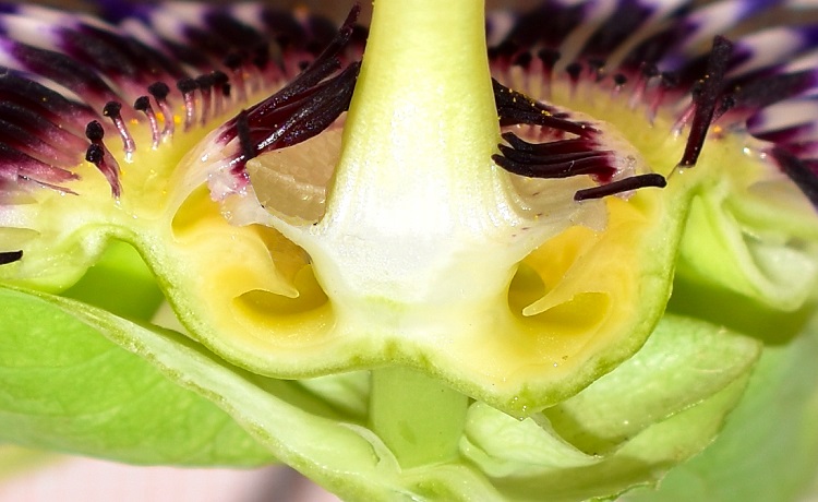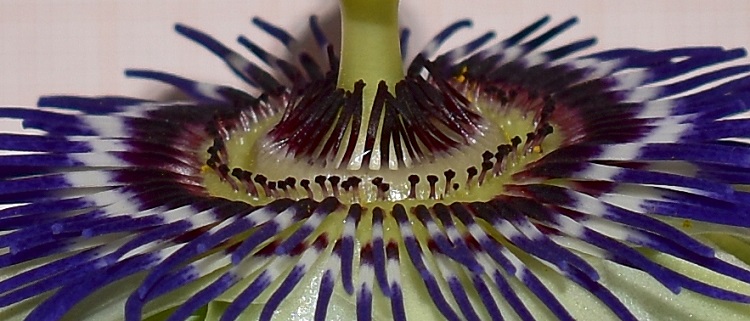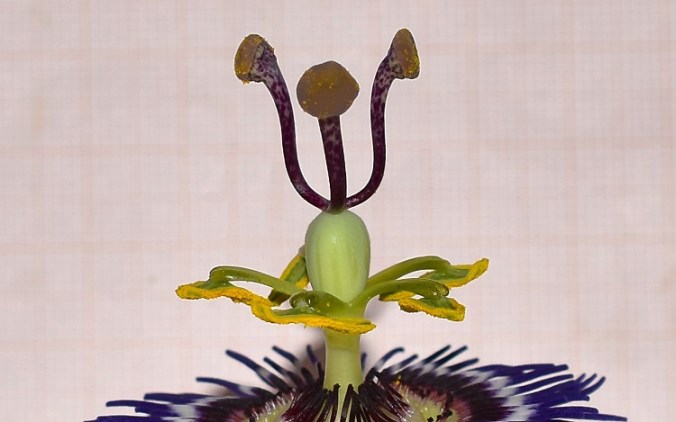 Tra i petali e gli organi riproduttivi sono interposte quattro corone di stami sterili (staminodi): due portano staminodi lunghi e appariscenti, splendidamente colorati (dall’esterno) di blu, bianco, viola profondo, e disposti radialmente; una di staminodi brevissimi e verticali, terminanti in una capocchia di colore viola scuro; una di staminodi piegati verso il pistillo centrale coma ad abbracciarlo, anch’essi di colore viola scuro.