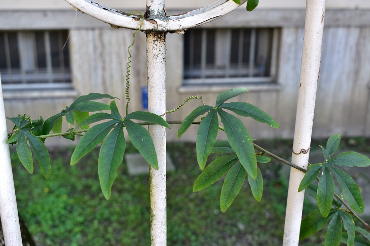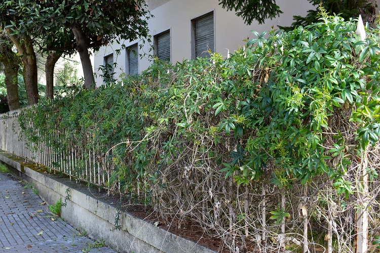 Via Duca degli Abruzzi, cresce su una ringhieraVia Sanmicheli, una anziana passiflora si arrampica sulla facciata dell’abitazione che nel settembre 1943 vide la prima riunione del CLN padovano. Foglia palmata a cinque (o sette) lobi. Disposizione alterna. Dall’ascella di ogni foglia emerge un viticcio, come se la liana avesse paura di non averne a sufficienza.Lobi a forma allungata, bordo intero; venatura centraleampia e chiara, molto meno visibili le secondarie. Lobi di consistenza coriacea, lucidi, di colore verde profondo. Pallida la pagina inferiore; base della foglia cordata. Picciolo di media lunghezza, con ghiandole nettarifere alla base.Venature terziarie a rete, e altre ghiandole sul bordo delle foglie.Una ghiandola da vicino. Forse c’è simbiosi con qualche specie di formiche.Viticci a spirale, è questo il suo modo di avvinghiarsi per ogni dove.I rami sono cavi. Fino a una certa età hanno sezione poligonale, poi da adulti si arrotondano.Corteccia liscia e marrone, anche in età avanzata.Fioritura bella e appariscente, senza alcun dubbio il fenomeno più affascinante; la pianta emette gli spettacolari fiori per tutta l’estate e oltre.Cinque sepali e altrettanti petali, molto simili in forma e dimensioni; alla base del ricettacolo tre brattee che permangono a lungo anche dopo la fruttificazione.Bocciolo, le brattee raccolte attorno ai sepaliI quali sepali si riconoscono per uno sperone a forma di ago arcuato il cui prolungamento corre per tutto l’asse mediano.