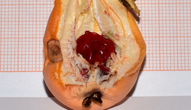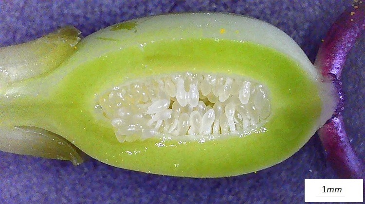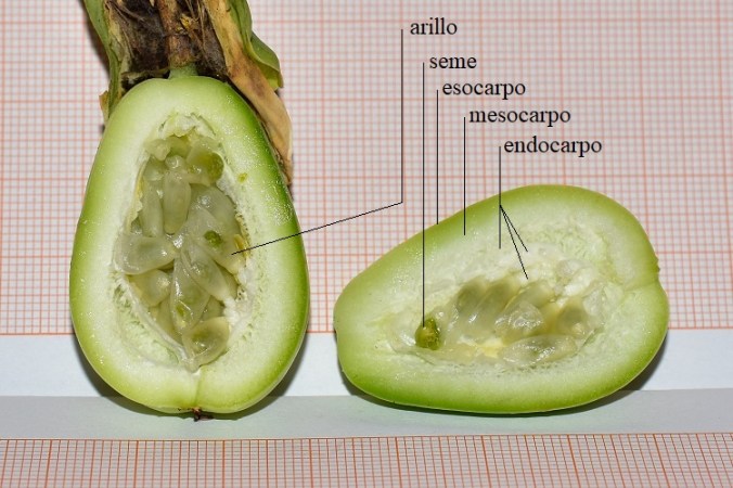 Staminodi delle prime due coroneAll’interno del ricettacolo corre una cavità nettarifera ad anello protetta da un sistema complesso di opercoli, appositamente costruito per irretire animali sprovveduti o forse complici.Sezione trasversale dell’ovario, tre alloggiamenti generati da tre carpelli saldati. Ovario, sezione longitudinale. Moltissimi ovuli attaccati alla placenta con un lungo peduncolo.Il frutto è una bacca di colore aranciato a maturitàResidui di stili e stigmi a una estremità, e di calice all’altra. I semi sono rivestiti da un arillo, attaccato saldamente all’endocarpo.A maturità ha colore rosso sangue.Tolto l’arillo, il seme appare ricoperto da una sostanza gelatinosaMentre il tegumento del seme è rigido e profondamente butterato.Due grossi cotiledoni e un embrione poco intellegibile.