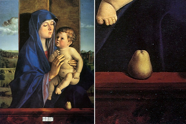 Caratteristiche ben raffigurate nella Madonna di Alzano (o Madonna della Pera) del Bellini, 1485, Accademia Carrara Bergamo.