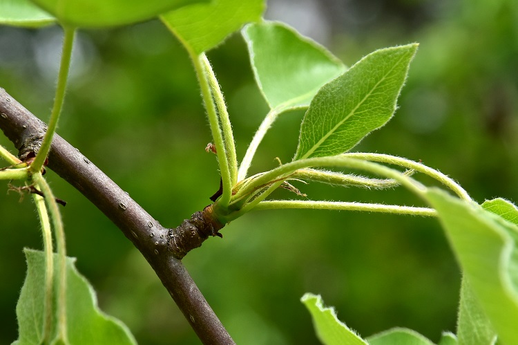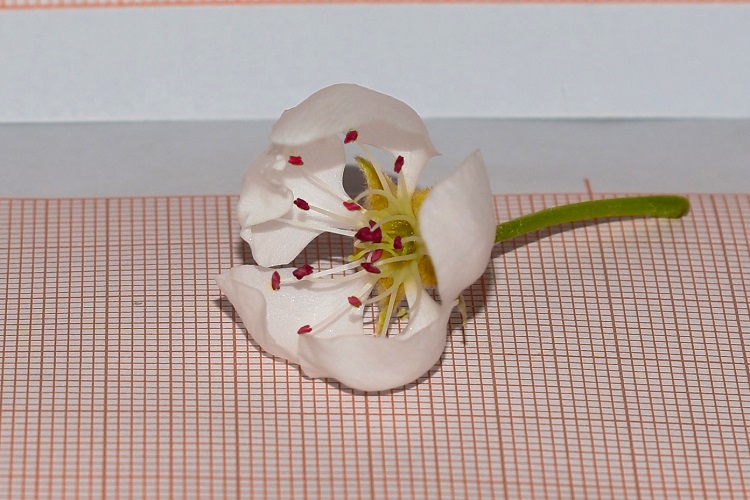 Via Poli, un austero giovanotto che fiorisce più o meno abbondantemente, ma che, a mia memoria, non ha mai dato frutti.Un vecchietto cresciuto spontaneo a San Nicolò (Lido di Venezia); lui invece molto prolifico.Coltivazione di peri in varie cultivar all’Orto Botanico di Torino.Foglia verde smeraldo, lucidissima, molto consistente ma non coriacea. Di forma alquanto allungata.Da giovane chiara e morbida. Bordo finemente seghettato, base acuta, apice acuminato. Pagina inferiore molto più chiara; pelosa da giovane. Picciolo lungo quasi quanto la lamina.Le foglie spuntano a ciuffi da tozzi brachiblasti.Gemma ai primi di marzo. Numerose le perule protettive.In autunno le foglie diventano ocra e poi, ma non sempre, rosse.Infiorescenza ad ombrella. Fiori bianchi portati da lunghi e robusti peduncoli.Cinque petali. Numerosi stami dalle antere purpuree; belle da vedere, però imbruniscono presto. Due teche e quattro sacche polliniche, filamento diafano……attaccato al dorso dell’antera.