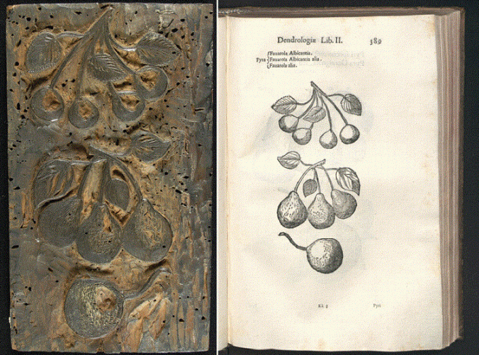 A sinistra matrice xilografica in legno di pero e a destra l’effetto che produce, da: Ulisse Aldrovandi (a cura di Ovidio Montalbano), Dendrologia, 1667, Pyra: Favarola Albicantia; Favarola Albicantia alia; Favarola alia, pag. 389. Dell’Aldrovandi possediamo una raccolta cospicua di tavole a colori. Nella foto due, delle numerose, dedicate al frutto del pero.