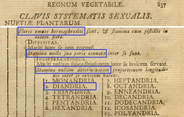 La corrispondenza fra i sistemi di Linneo e di Jussieu è debolissima (qualcuno direbbe inesistente), eppure per certi gruppi ci sono significative sovrapposizioni, è il caso degli alberi e arbusti con due stami e un pistillo nel sistema sessuale del primo e della famiglia dei gelsomini e ulivi nel sistema (o metodo) naturale del secondo.