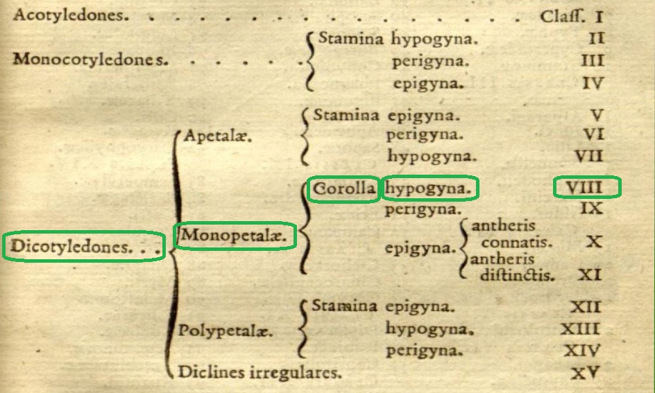 La distribuzione del carattere ‘avere due stami e un pistillo’ lungo la successione ordinata delle famiglie, nonché la frequenza con cui compare il carattere nelle singole famiglie, sembra confermare una delle condizioni che Jussieu richiede al suo sistema, e cioè che la successione degli ordi (famiglie) non sia arbitraria ma costruita in modo che famiglie vicine condividano il maggior numero di caratteri, in modo da ottenere una variazione graduale di questi ultimi passando da una famiglia all’altra. Jussieu chiama questo requisito Principio di continuità; ed è facile capire perché. Purtroppo non è possibile dilungarsi oltre, in un misero post, su questo importante assioma della teoria jussieana, rimando chi fosse interessato al dotto articolo di P. F. Stevens.