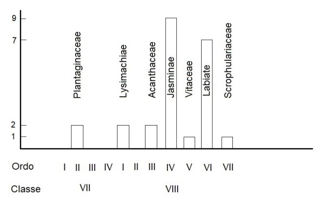 Il quadro generale delle famiglie di Jussieu (per le dicotiledoni, le sole coinvolte). Solo due generi paiono collocati in famiglie molto distanti, mentre gli altri si addensano attorno alle Jasminae.