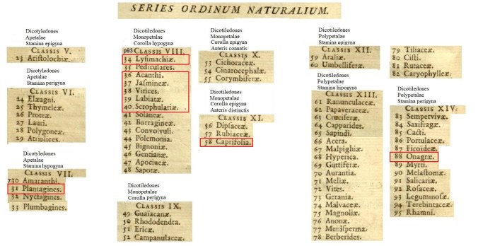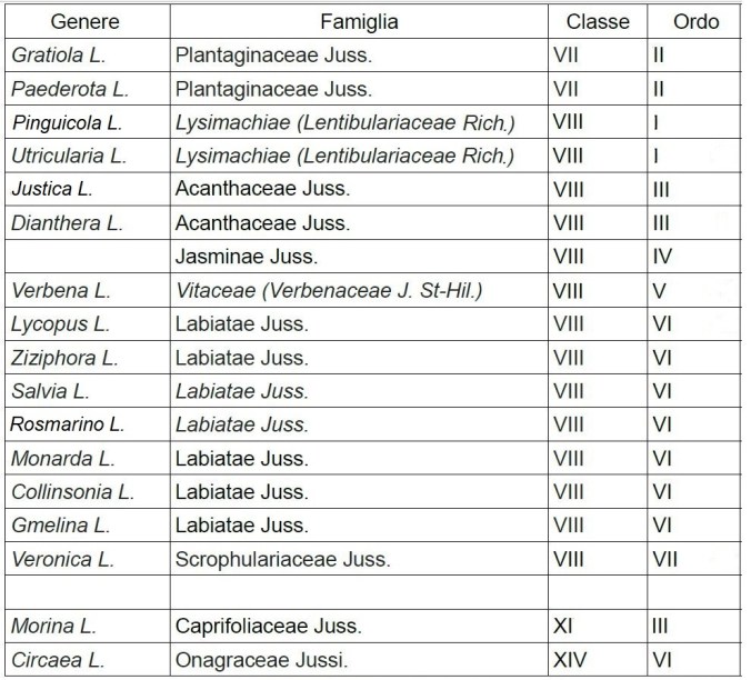 Ho disposto nella prima colonna i generi erbacei linneani (a due stami e un pistillo) mentre nella seconda ho indicato le rispettive famiglie nel sistema di Jussieu. La terza colonna indica la classe di appartenenza di quelle famiglie e la quarta l’ordo (famiglia).