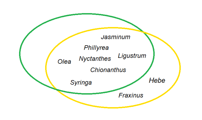 In figura la sovrapposizione fra l’insieme linneano in verde e il raggruppamento di Jussieu in giallo. Restano fuori i frassini che pur avendo due stami e un pistillo sono annoverati da Linneo tra le piante poligame dioiche (23. classe), e il genere Hebe che ha due stami, ma non compare né in Genera Plantarum nè in Species Plantarum di Linneo.