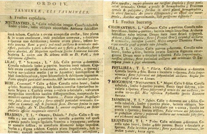 Alla pagina 104 di Genera Plantarum compare la descrizione della famiglia, che ci affrettiamo a esaminare. Calice e corolla tubiforme, tranne i frassini, ci tiene a precisare il buon Jussieu, i cui fiori o non han corolla o l’hanno a petali separati. Stami perlopiù due. Stilo unico; stigma bifido. Frutti capsule o bacche […] Tronco arbustivo o arboreo […] Foglie perlopiù opposte. […]