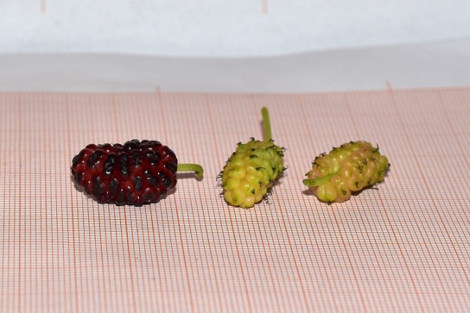 Broussonetia papyrifera. A destra frutto maturo, i singoli frutticini si ergono perpendicolar-mente alla superficie sferica (il contorno del ricettacolo), sono rossi o arancione e portano in cima acheni e residui di stigma. A sinistra frutto immaturo. (Link alla foto originale)