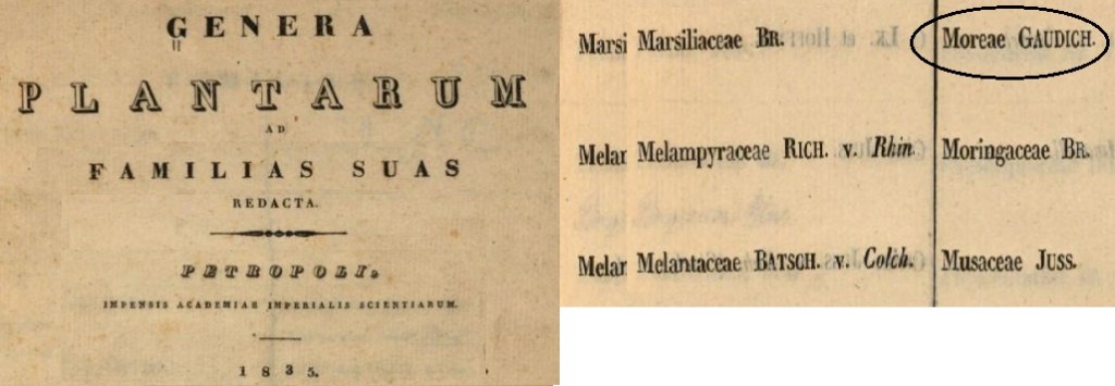 A quanto pare il nome compare per la prima volta in questa strana pubblicazione: Genera Plantarum ad familias suas redacta, San Pietroburgo (?) 1835, a sinistra il frontespizio, a destra la pagina 13 col nome del genere e la sigla del Gaudichaud. Il frontespizio non porta l’autore, ma le fonti attribuiscono l’opera a Carl B. von Trinius – botanico esperto di graminacee. Si tratta, come si vede, di un semplice elenco di nomi di famiglie con la sigla del botanico annomatore. Incerto il luogo di pubblicazione, forse San Pietroburgo (dove ha vissuto a lungo il Trinius, e vi è morto) ma non ho trovato alcuna fonte che attribuisse questo nome alla città, che pure di nomi ne ha avuti tanti.
