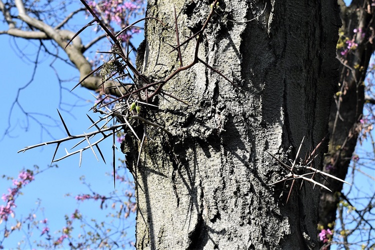 Corteccia grigia. Si fessura longitudinalmente, non in modo profondo, ma tanto da permettere alle falde di distanziarsi fra loro e staccarsi alquanto dal tronco.Fuori dai viali cittadini vivono quella con le spine, e che spine!
