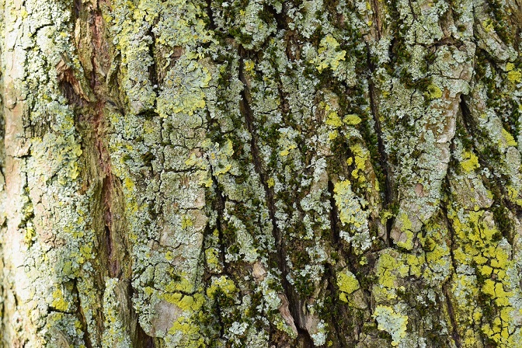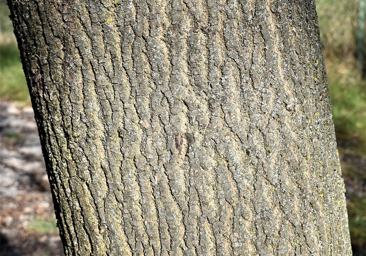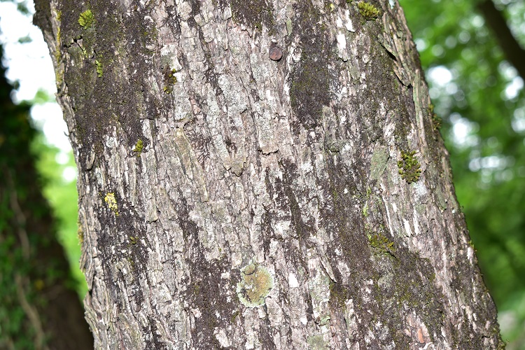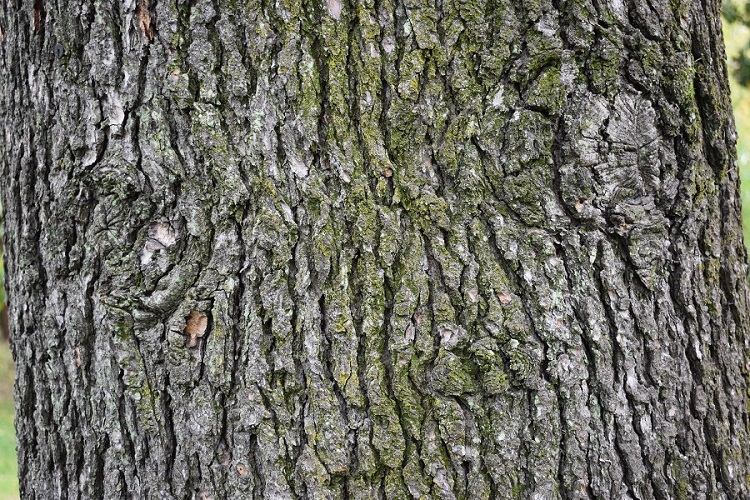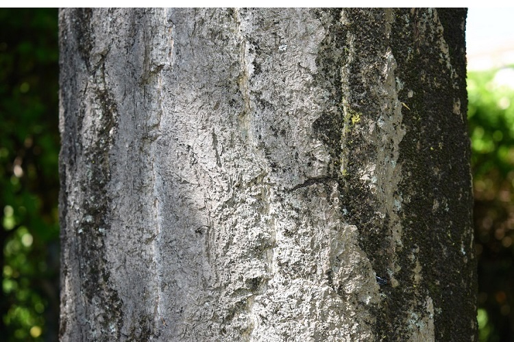 Levigata al tatto; più che grigia è argentata. Con l’età si frattura in piccole placche che tendono a sollevarsi lasciando intravedere tessuti rossastri.