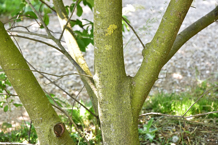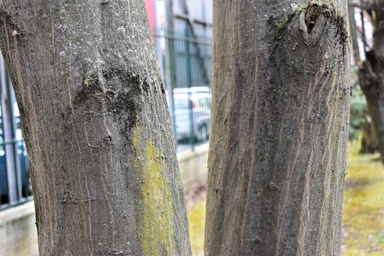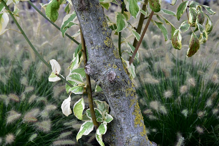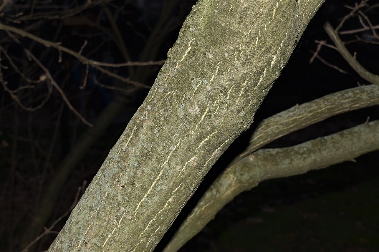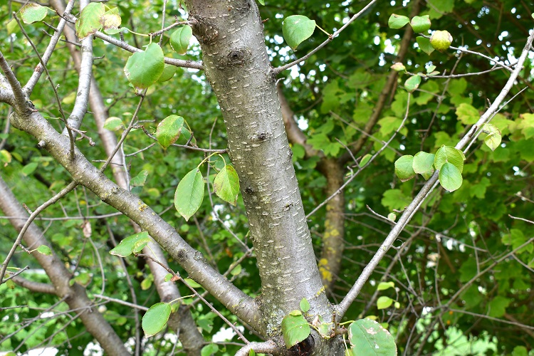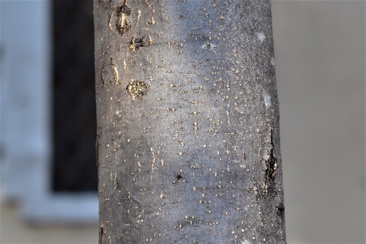 Corteccia liscia, grigio scura, opaca. Rami giovani con lenticelle Nei giardini vivono esemplari anche vetusti le cui lenticelle le danno un aspetto più ruvido.