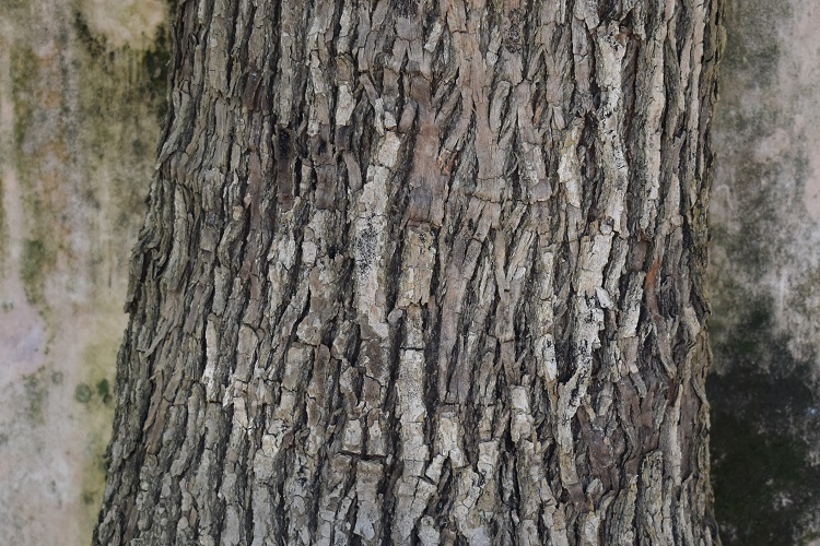 Corteccia a varie tonalità di grigio. Quanto alla forma: solchi profondi e irregolari molto distanziati fra loro. Le creste hanno profilo arrotondato a strati sovrapposti ben evidenti. Da giovane colore grigio più chiaro; non crepata ma ugualmente ruvida.