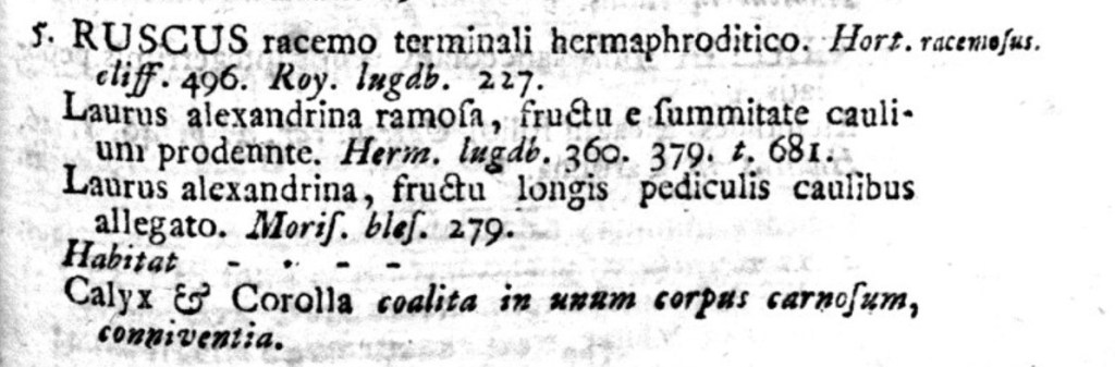 La pagina 1041 di Species Plantarum dove Linneo dà un nuovo nome dopo che aveva chiamato la pianta Ruscus racemo terminali hermaphroditico in Hortus Cliffortianus, così come aveva fatto Adrian Van Royen (Florae Leidensis). Nell’ultima riga compare un carattere veramente singolare della pianta sul quale ci soffermeremo.