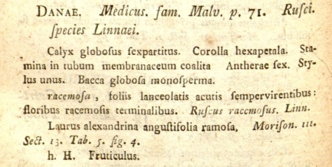 La pagina 170. Moench crea il nuovo genere e ne dà i caratteri, fra questi: gli stami si saldano a formare un tubo. Alla sesta riga enuncia il nuovo nome e alla settima ci spiega che Linneo l’aveva collocata nel genere Ruscus (non cita Species Plantarum). Ricorda infine il vecchio nome Laurus alexandrina (Robert Morison, Plantarum Historia, 1799, Oxford) da cui proviene di certo l’attuale nome volgare in tutte le lingue… volgari.