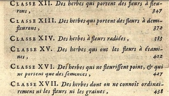 Seguono due classi (XVI e XVII) di erbacee che non producono fiori o frutti; sta parlando di alghe, felci, funghi, eccetera. E anche qui le cose sono molto più complicate di come si credeva alla fine del Diciassettesimo secolo; e di quello che si crederà per tutto il Diciottesimo.