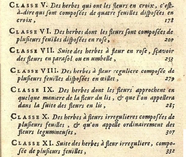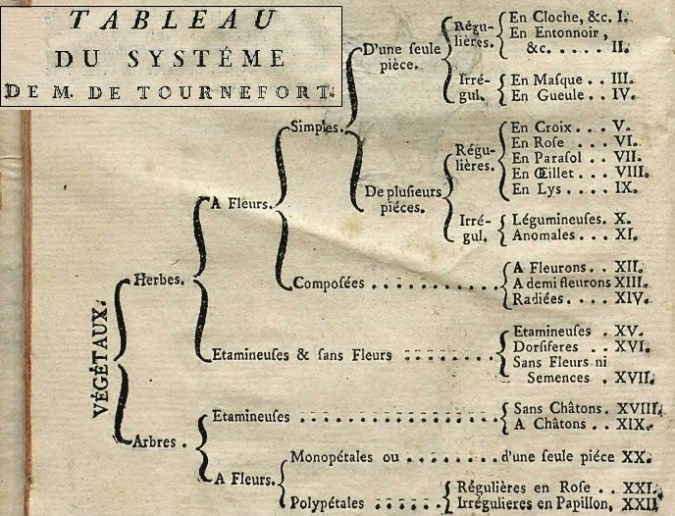 I generi sono raccolti in base alla forma della corolla in ventidue classi. Dalla I alla XVII le erbacee, dalla XVIII alla XXII alberi e arbusti. Ogni classe è suddivisa in sezioni (gli ordi di Linneo o le famiglie di Jussieu) in un sapiente gioco tra le descrizioni delle corolle e quelle di frutti, semi, ricettacoli. Nella foto, schema tratto da un manuale a firma di Lestiboudois (?), Abrege Elementaire de Botanique, Lilla, 1774. Sì, avete capito bene 1774, dunque, almeno fino alla seconda metà del Settecento si educava al sistema di Tournefort.