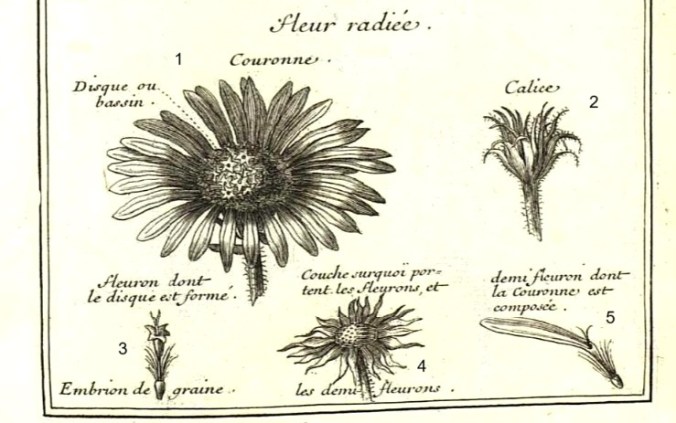 Tavola 11 – da sinistra: flosculo tubuloso (‘fleuron’) e flosculo ligulato (‘demi-fleuron’). Fiori ben noti al blog poiché già descritti nel post dedicato al topinambur (converrà seguire tutta la descrizione del fiore per farsene un’idea adeguata). Torna a (*)