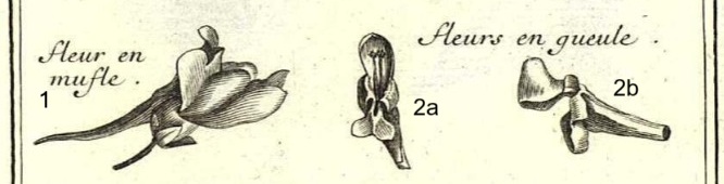 Si distinguono: corolla personata 1; corolla labiata: vista frontale 2a e vista laterale 2b.