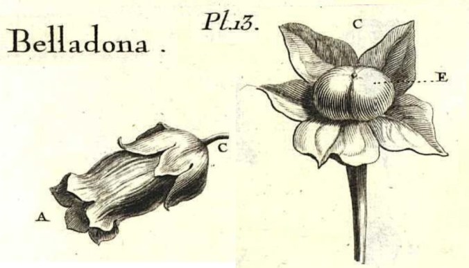 Belladonna: ‘Il fiore A è una campana divisa generalmente in cinque parti … Il calice C è un secchio dentellato … Allorché questo fiore appassisce il pistillo diventa un frutto quasi rotondo e pieno di succo’.
