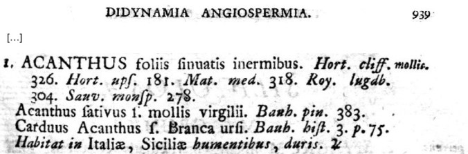 Pagina 639. Classificato nell’ordine: a quattro stami, di cui due lunghi (didynamia), e per frutto una capsula (angiospermia = seme protetto). Linneo ci dice che le foglie han bordo senza spine e scavato a seni. Il simbolo di Giove indica erbacea perenne.